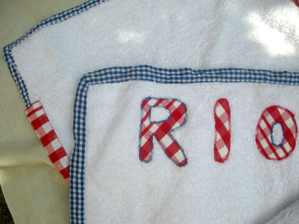 This is one example for a futon towel set. The small towel will be put on the futon sheet and the large towel will be used as a blanket. The towel fabric is really nice for hthe end of the Japanese summer: still warm, and a little windy. The hem is appliqued and there’s a red and blue tape around all edges. This checkered fabric in combination with the white towel reminds much of traditional swedish embroideries….