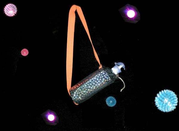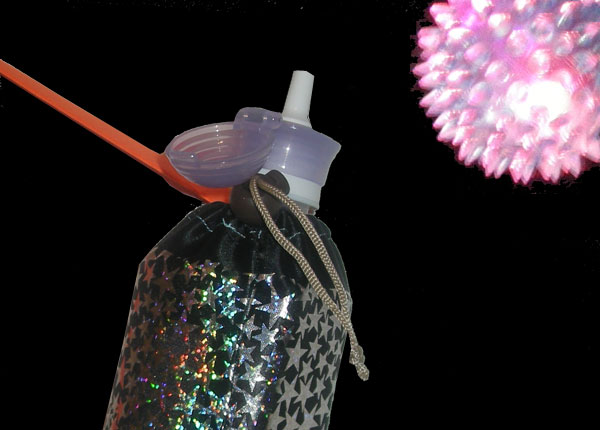 A space shuttle? Looks like it, but in fact it’s a pet bottle in a sparkling star coat! The shiny neon orange strap make it easy to carry and a the screw-fastened straw make drinks even more delicious.