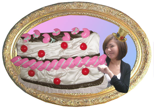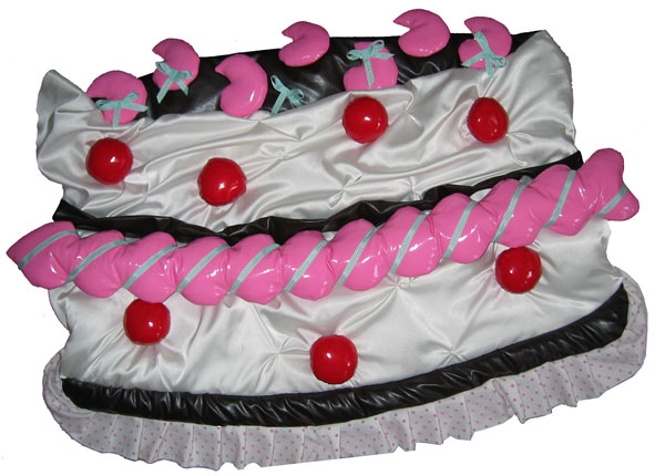 For one show I had to make a huge cake in the dimensions of 1m x 60cm. It looked delicious … the creamy part was made of shiny satin, chocolate, cherries and pink cream dots were made of a plastic covered polyester.
