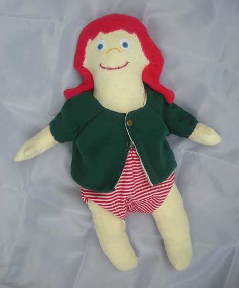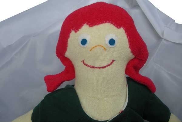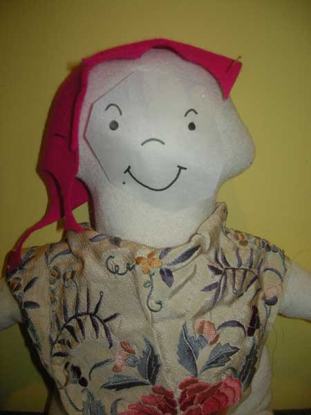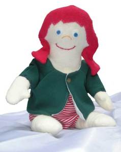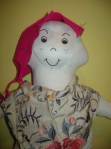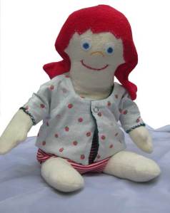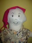 The doll is about 30 cm long and made of stretch frotée in light beige color. I filled it with
