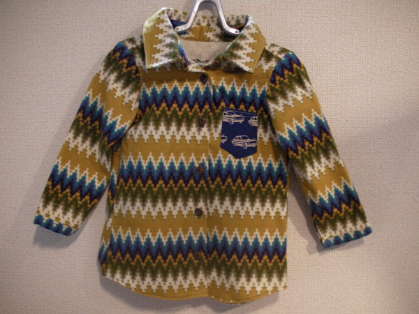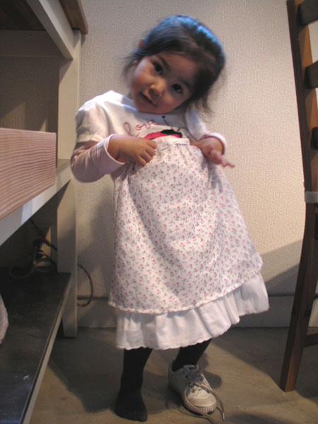 Proceeding is this little girl’s dress: top layer in cute flower print gaze, inner layer by light white gaze with a fringe around the hemline.