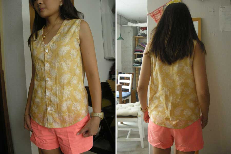 This is the “second” project of my new student Rica. The first was a skirt, rather simple, but for the second one she gor brave right away!! We copied the pattern from one of her owned blouses and look at the result: super nice and convenient for the last Summer and first Autum days.