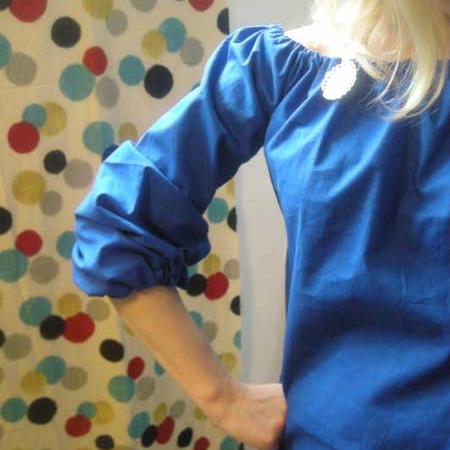 It needs a trend to give the off-shoulder blouses a chance to come back, but I always liked them. They can be dresses up r be worn casually with jeans. This model sits loose around the torso and arms. It is held by an elastic around the shoulders and an elastic at the wrist.
