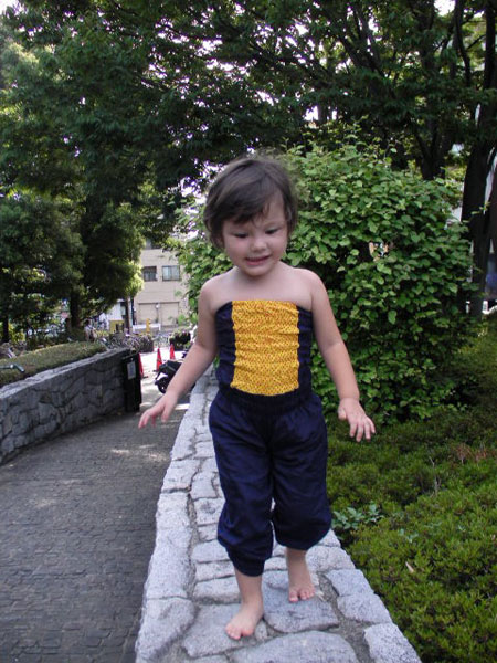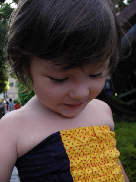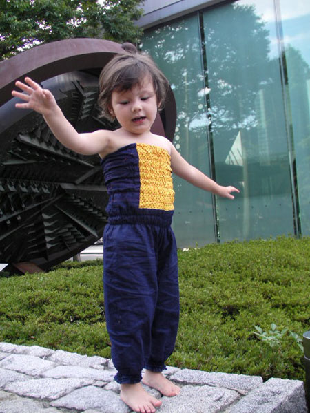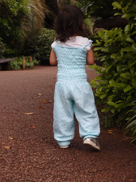 This little overall is a charming outfit for little ladies. The top is comfortable, because of the moveable elastic and the trouser part is wide and airy. Shirring is fun technique to learn and with a little practice you will master it with joy!