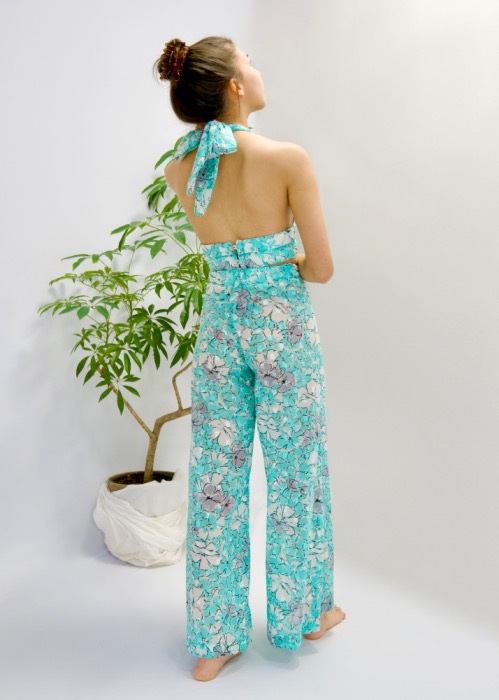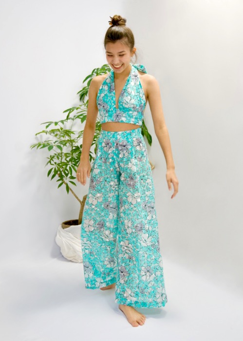 I’m not quite sure, but someone came up with the name “Florida Set” for this light Summer combo. It’s a bra top that is tied together at the neck and holds the under bust with three elastic tapes. The trousers are fitted to the waist, have two large pleats at the front, wide legs , a side zipper and are extra comfortable to wear with the elastic tapes around the waist.