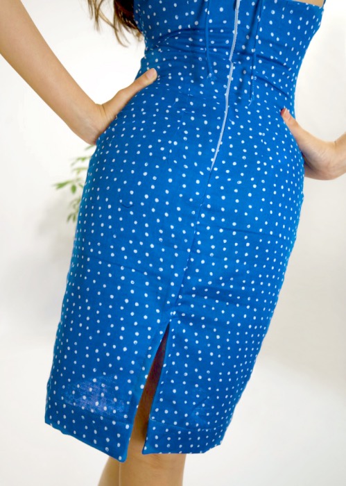 This Mini Tie up dress has fine spaghetti straps and closes at the back with a ribbon and an invisible zipper. The dress smoothes around the body and ends with a slit at the center back.